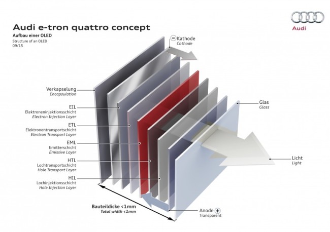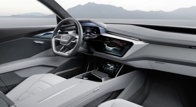 The interior of the e-tron quattro provides seating for up to four, with boot space count of 615 litres. All displays in the interior use OLED technology. A large display on the right is provided for media and navigation control. An LTE Module connects the Audi e-tron quattro concept with the internet.